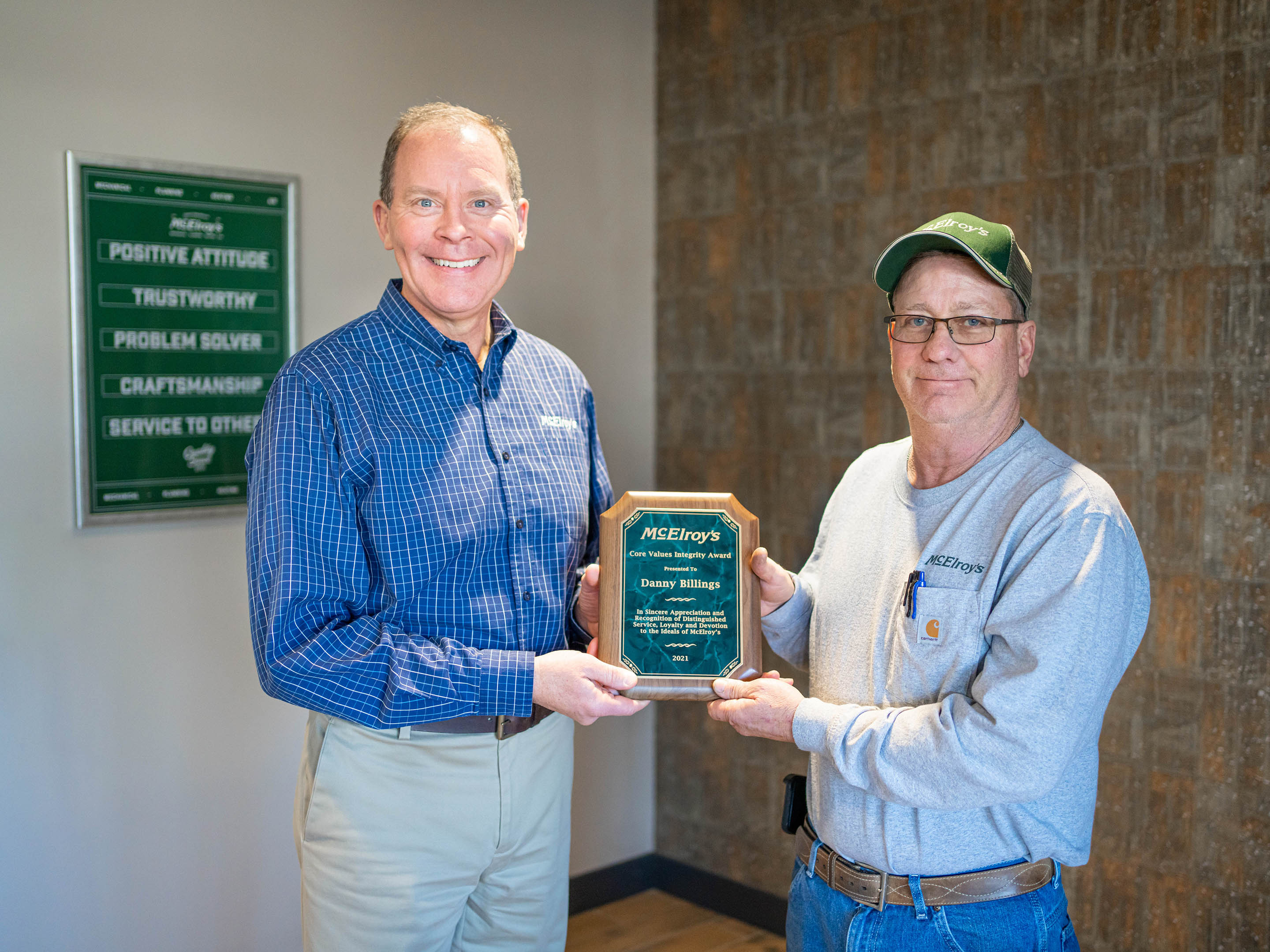 January 13, 2022Danny Billings, a member of the McElroy’s team for 37 years, has been named the 2021 honoree of the McElroy’s Core Values Integrity Award. “Many deserving McElroy’s team members were nominated, and the selection committee carefully reviewed them all,” said McElroy’s President Dan Beal. “Danny Billings was ranked as the leader in consistently demonstrating our values in all that he does.”